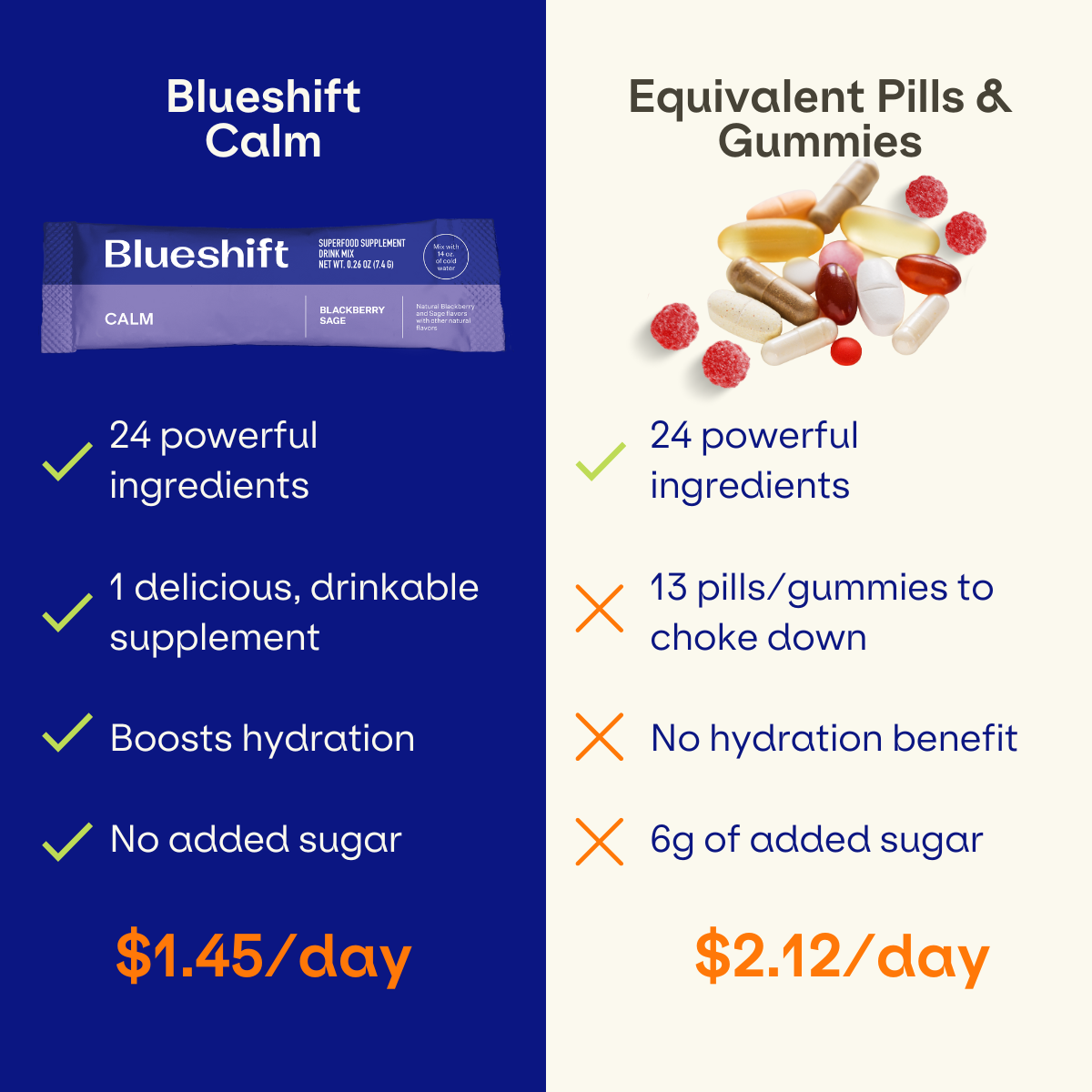 Stress from work, finances, relationships, and day-to-day events can leave us in a constant state of burnout.* Chronic stress is harsh on our minds and bodies, so keeping Blueshift Calm in the mix is a good way to help you unwind and relax without feelings of drowsiness.*